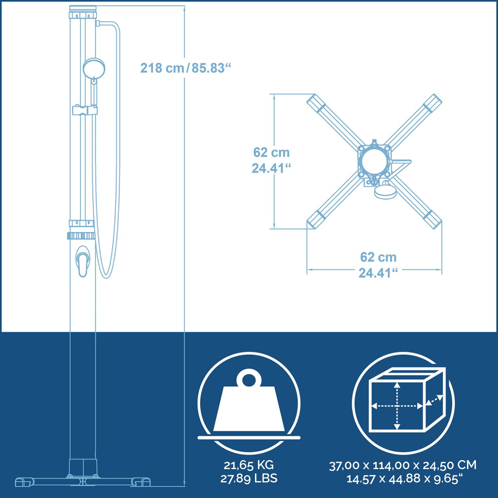 Die imposante Höhe von 218 cm machen diese Dusche zu einer echten Bereicherung für Ihren Poolbereich. Die Installation ist mühelos - befestigen Sie die Dusche direkt an Ihrer Terrasse oder Ihrem Balkon, indem Sie die mitgelieferten Schrauben verwenden. Einmal aufgestellt, können Sie die Temperatur und den Wasserdurchfluss bequem über den Temperaturregler einstellen und anpassen. Erleben Sie eine nahtlose Verbindung zu Ihrem Gartenschlauch über den praktischen Gartenschlauchanschluss (Schlauch nicht im Lieferumfang enthalten).