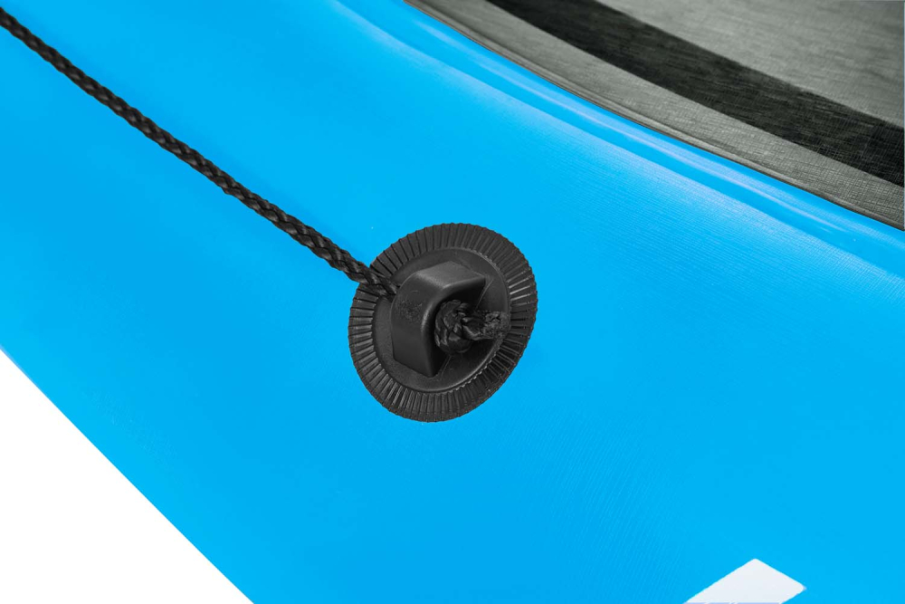 Das reißfeste Inflata-Shield™ -Material sorgt dafür, dass das Kajak eine Beständigkeit gegenüber verschiedensten Beschädigungen besitzt. Zudem wird die Überdehnung minimiert und die Griffigkeit verbessert. Das komfortable Cockpit verfügt über einen verstellbaren, aufblasbaren Sitz mit einer Rückenlehne für zusätzlichen Halt. Dank des mitgelieferten flexiblen Stauraums und Netzes bietet dieses Kajak außerdem viel Platz für Snacks oder zusätzliche Ausrüstung.