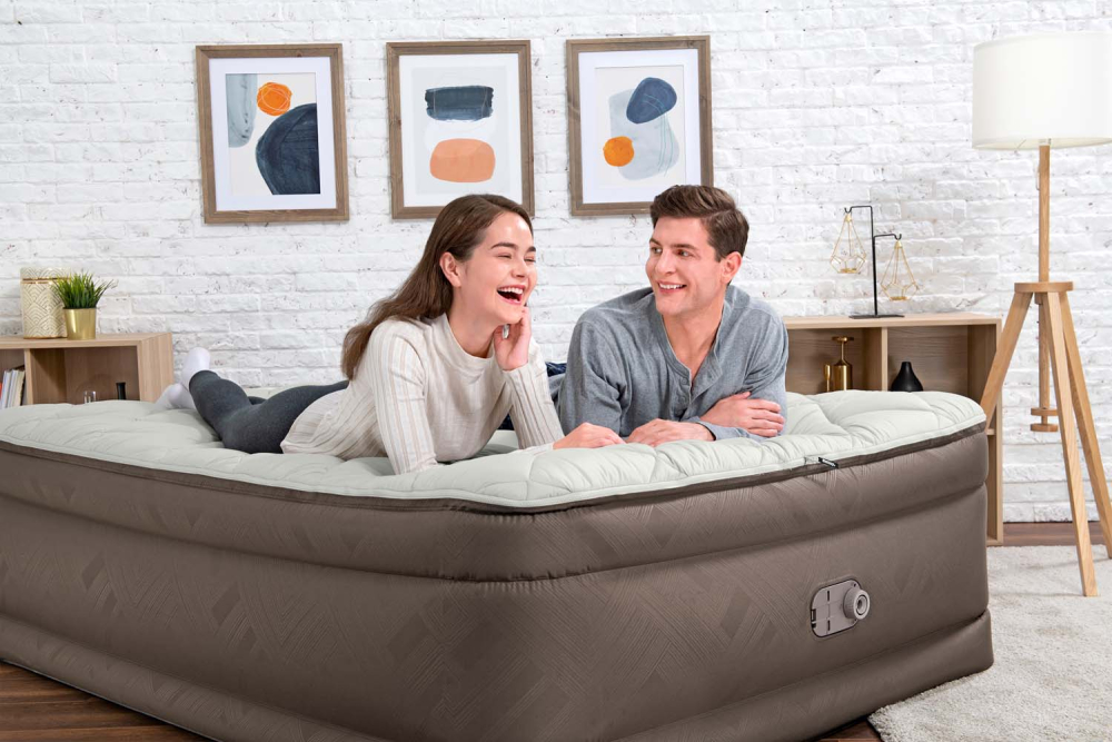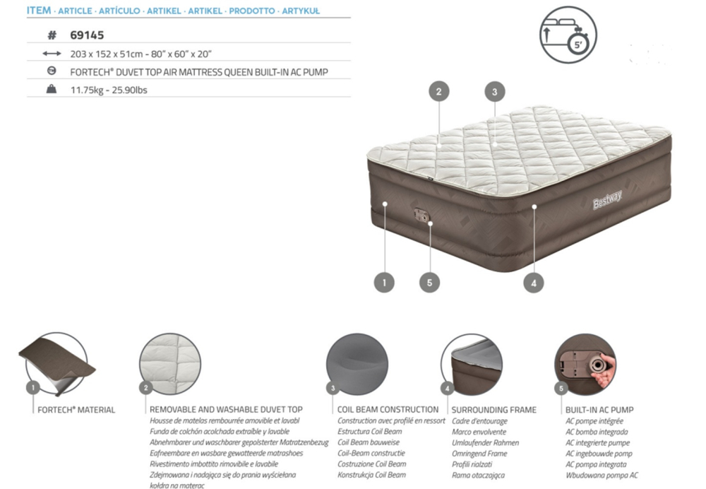 Das Highlight dieses Luftbettes ist die integrierte Elektropumpe, mit der Sie das Luftbett in nur 5 Minuten vollständig aufpumpen können. Kein mühsames manuelles Aufpumpen mehr - einfach die Pumpe einschalten und das Luftbett ist bereit für eine erholsame Nachtruhe. Das Fortech -Außenmaterial ist beeindruckend strapazierfähig. Es ist 75 % reißfester, 92 % dehnungsbeständiger und 150-mal abriebfester als traditionelles PVC. Das bedeutet, dass das Luftbett dauerhafte Zuverlässigkeit bietet.
