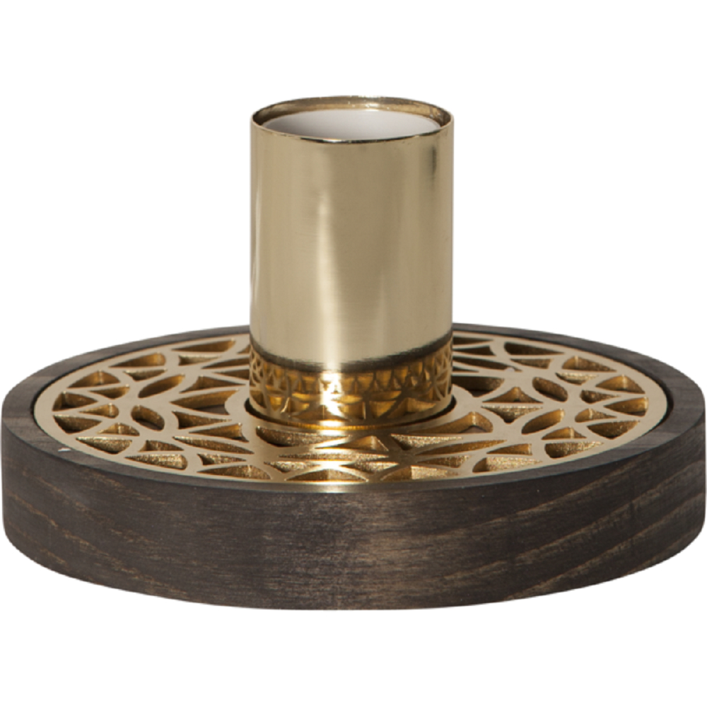 Messingfarbene STAR Trading Leuchte ''Magic'' mit braunem Holzfuß und E27-Fassung, 1,8m Anschlusskabel und Schalter. Geeignet für Leuchtmittel bis max. 40W. Lieferung ohne Leuchtmittel. Nur für den Innenbereich.
