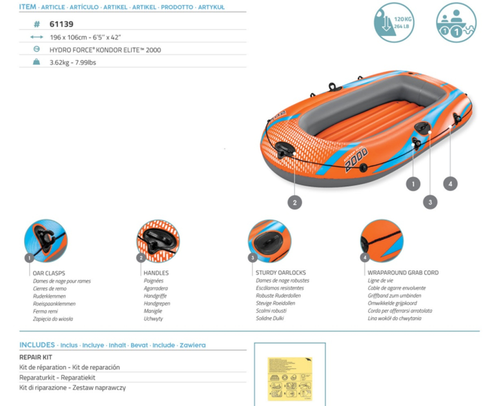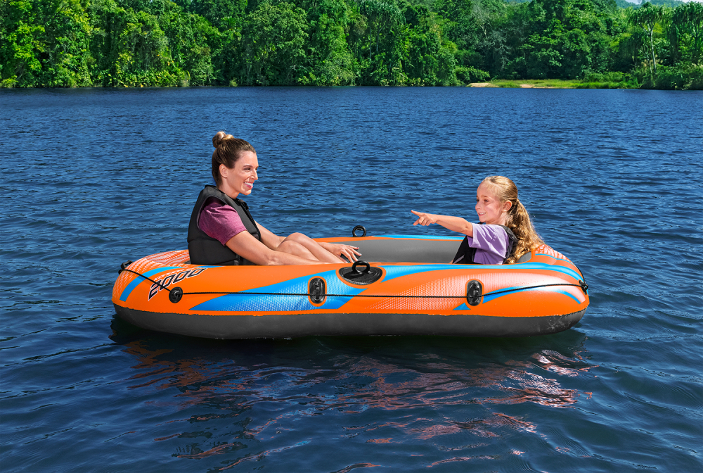 Das Abenteuer auf dem Wasser wartet schon! Mit dem Bestway® Schlauchboot Kondor Elite™ 2000 steht dem Ganzen nichts mehr im Wege. Dieses geräumige Schlauchboot ist perfekt für eine erwachsene Person und ein Kind, mit einem Gesamtgewicht von bis zu 120 kg, und bietet somit eine ideale Möglichkeit für gemeinsame Erlebnisse auf dem Wasser. Das Kondor Elite™ 2000 hat eine großzügige Größe von 196 x 106 x 31 cm und verfügt über einen aufblasbaren Boden, der nicht nur für mehr Komfort sorgt, sondern auch die Stabilität auf dem Wasser erhöht.