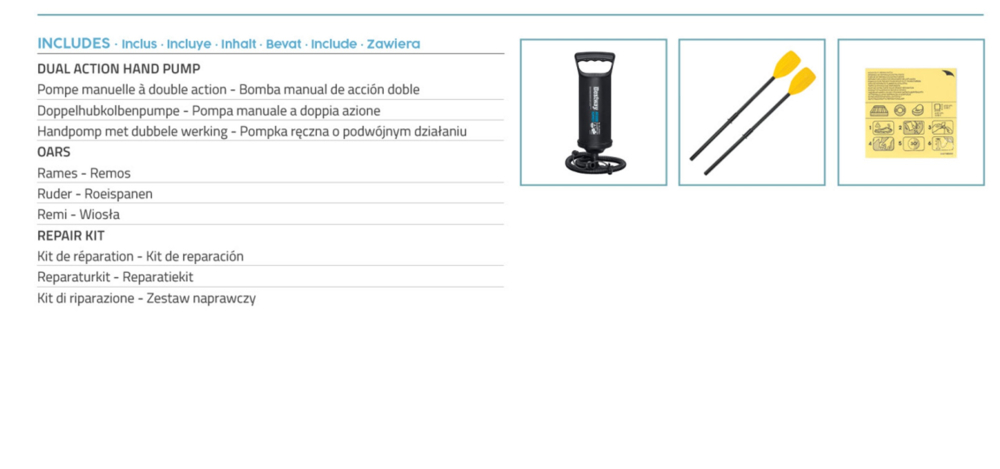 Das Bestway® Hydro Force® Schlauchboot-Set Trek™ X3 kommt mit allem, was Du für ein perfektes Wassererlebnis benötigst. Im Set enthalten sind ein Paar 124 cm lange Ruder, die Dir eine kraftvolle und effiziente Fortbewegung ermöglichen. Die Air Hammer™ Handpumpe sorgt für ein schnelles und einfaches Aufpumpen des Bootes. Solltest Du einmal eine kleine Reparatur benötigen, ist ein Reparaturflicken ebenfalls im Lieferumfang enthalten.