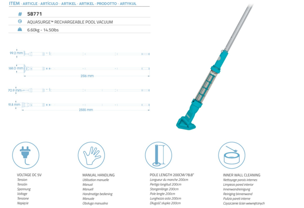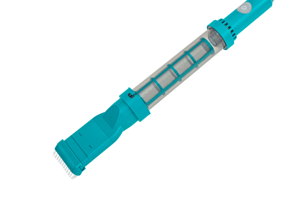 Tauchen Sie ein in eine neue Dimension der Poolpflege mit dem batteriebetriebenen Poolsauger Bestway® AquaSurge™! Perfekt geeignet für Pools bis Ø 610 cm ist dieser Sauger der Inbegriff von Effizienz und Komfort für eine kristallklare Pooloase. Erleben Sie eine völlig mühelose Reinigung dank des kabellosen Designs des AquaSurge™. Dieser Sauger wird einfach per Knopfdruck aktiviert und sorgt für eine gründliche Poolreinigung, die ihresgleichen sucht. Der AquaSurge™ ist mit einem integrierten Akku ausgestattet, der Ihnen eine beeindruckende Laufzeit von bis zu 50 Minuten bietet. Die Ladezeit von nur 4-5 Stunden stellt sicher, dass Ihr Sauger immer einsatzbereit ist, wenn Sie ihn brauchen. Dank des 3-teiligen Haltestiels passt sich der AquaSurge™ flexibel an die Bedürfnisse Ihres Pools an. Zusätzlich kann der Haltestiel mit anderen Reinigungsgeräten und Zubehörteilen (Ø 30 mm) verbunden werden, was Ihre Poolpflege noch vielseitiger macht. Der transparente Schmutzbehälter mit einem Fassungsvermögen von 0,54 Litern ermöglicht eine klare Sicht auf den Füllstand. Für die Reinigung von Wänden und Ecken sind zwei verschiedene Aufsätze enthalten.