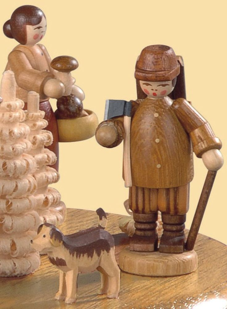 Von der großen Naturverbundenheit der Erzgebirgler zeugt diese wunderschöne Pyramide aus dem Hause Müller Kleinkunst. Auf drei Etagen wird der Lebensraum Wald und Wiese dargestellt. Auf der untersten Ebene grasen die Rehe gemütlich in der Nähe einer Futterkrippe. Darüber schleppt ein Forstarbeiter seine Holzausbeute auf dem Rücken und eine Pilzsammlerin freut sich über ihre Funde. Auf der oberen Laufscheibe wacht ein Hirte über seine friedlichen Schäfchen. Gekrönt wird das Kunstwerk von dem typischen Stilelement der Müllerschen Pyramiden, dem Krönchen aus Rundbögen am Flügelansatz und drei gedrechselten Bäumchen, die für die Reichhaltigkeit der erzgebirgischen Wälder stehen. Ein Synchrongetriebemotor mit 6,8 Umdrehungen treibt das Flügelrad und die beiden Laufscheiben an. |