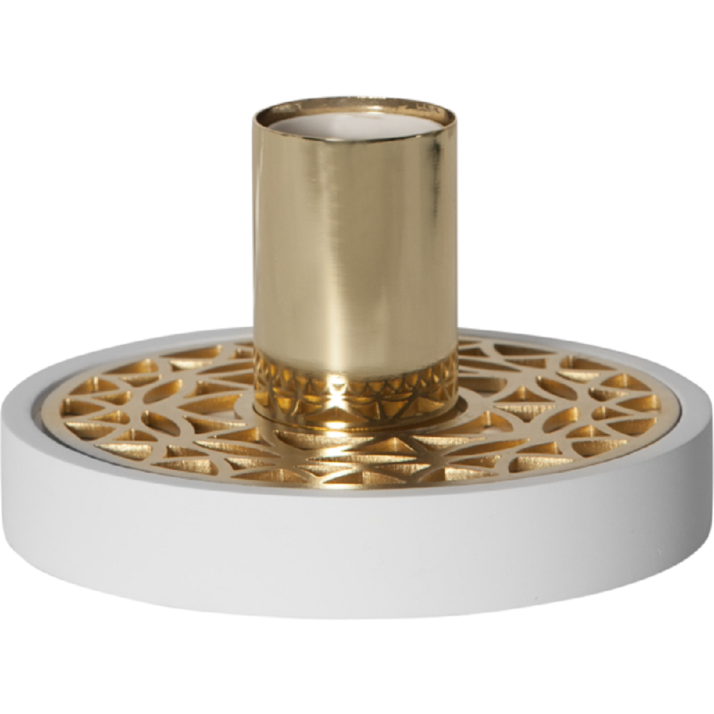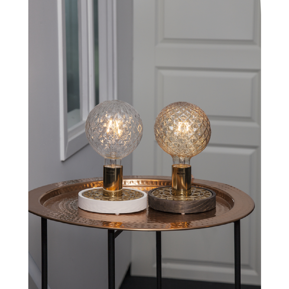 Messingfarbene STAR Trading Leuchte ''Magic'' mit weißem Holzfuß und E27-Fassung, 1,8m Anschlusskabel und Schalter. Geeignet für Leuchtmittel bis max. 40W. Lieferung ohne Leuchtmittel. Nur für den Innenbereich.