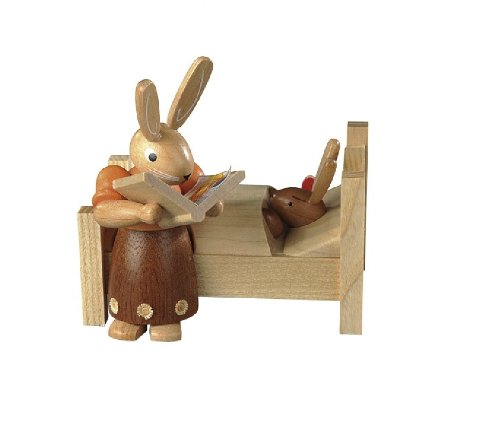 Lesende Hasenmutti am Bett ihres Kindes. Durch die neue Farbgebung kommen nicht nur die handgefertigten Blumen am Rocksaum der Hasenmutti besser zur Geltung, sondern auch das träumende Hasenkind.