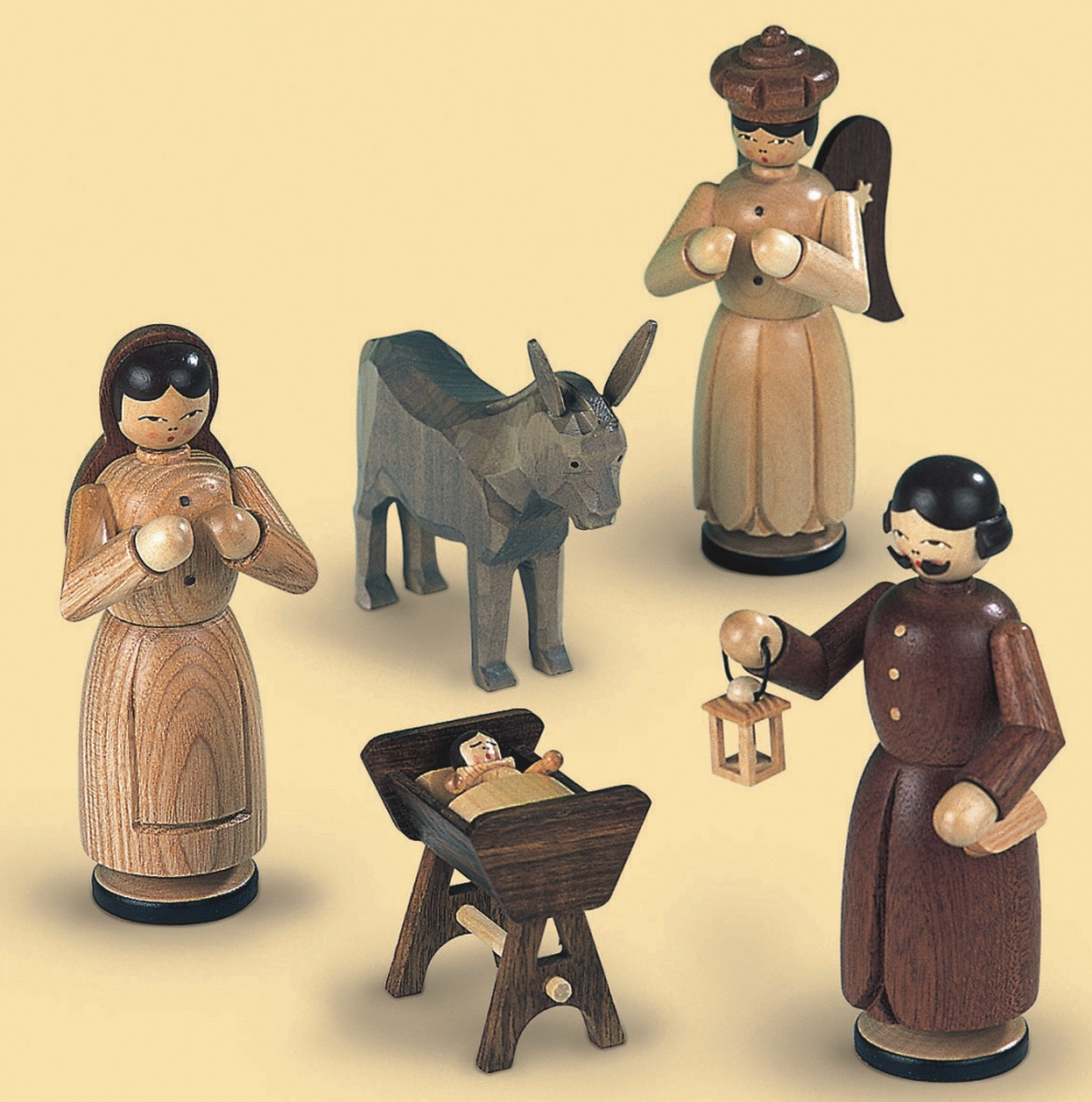 Die unterschiedlichen Fräsungen in den Körpern der durchschnittlich 13cm großen Figuren stellen Gewänder und Schürzen dar und unterstreichen ihren besonderen Charakter. Die handgeschnitzen Tiere sind aus Lindenholz gefertigt und teilweise farbig lasiert. Auf die gesamte Pyramide ist ein Klarlack aufgetragen, der die edlen Hölzer wirkungsvoller erscheinen lässt und vor Staub und Verfärbung durch Sonneneinstrahlung schützt. Für eine bessere Reinigung der Pyramide werden die Figuren nicht auf die Pyramide geleimt.
