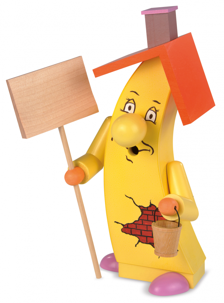 Auch wenn der Putz mal bröckelt – mit diesem farbenfrohen Anstrich kommt beim Betrachter Freude auf. Und weil man manchmal auch vor seiner eigenen Türe kehren sollte, hat die lustige Räucherfigur gleich Eimer und Schippe dabei. Bei den Schneebergen in Seiffen kommt man mit dem Besen eh nicht weit …