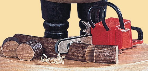 Mit Axt und Kettensäge bewaffnet, schneidet der Waldarbeiter seine gefällten Bäume zu. Der Rohstoff Holz ist seit vielen Jahren für die Wirtschaft im Erzgebirge von unschätzbarem Wert. Zu Zeiten des Bergbaus wurde er zum Abstützen der Stollen verwendet. Als die Erzförderung unrentabel wurde, entwickelte sich zu Ende des 18. Jahrhunderts die erzgebirgischen Holzkunst. - Knuffige Räucherfigur aus einheimischen Holzarten gefertigt.