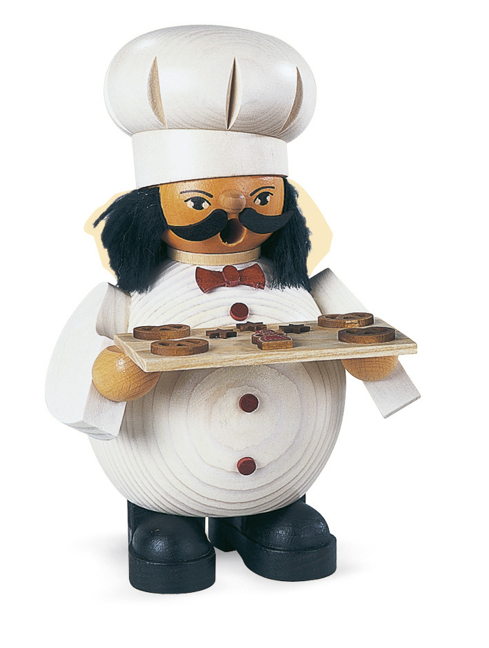 Köstlich duftende Leckereien trägt der kleine, dickbauchige Bäcker auf seinem Blech. Liebevoll handgefertigte Räucherfigur aus über 30 Einzelteilen.