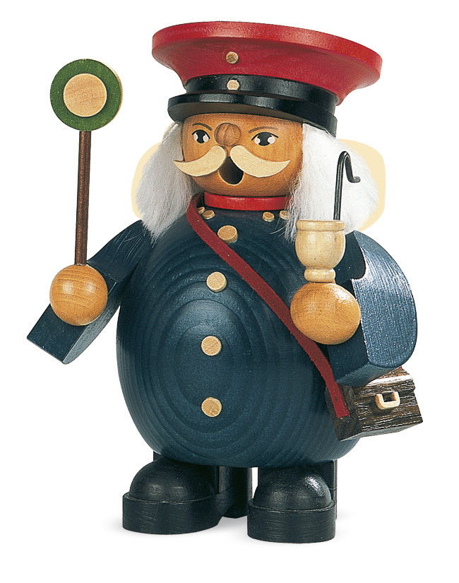 Für Eisenbahnfans ein Muss! Der kugelbauchige Schaffner mit Eisenbahnertasche zieht genüsslich an seiner Pfeife, bevor er der Lock das Zeichen zum Start gibt. Aufregend detailreich wurde der kleine Geselle in liebevoller Handarbeit aus Naturhölzern gefertigt.