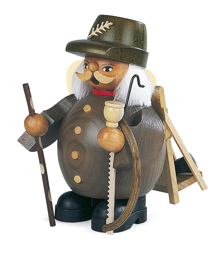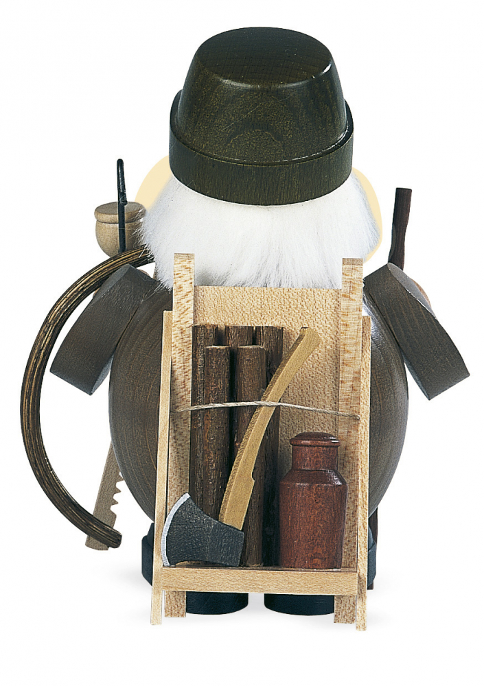 Der kleine, farbige Waldarbeiter steckt voller handwerklich liebevoll umgesetzter Details. Er stützt sich auf einen Wanderstock, um seine schweren Lasten besser tragen zu können. Um die Schulter hängt seine Säge und auf dem Rücken trägt er ein Korbgestell zum Transportieren des gesägten Reisigs. In der Hand hält der rundliche Gesell seine Pfeife, die er zwischen der Arbeit in einer Pause genüsslich raucht.