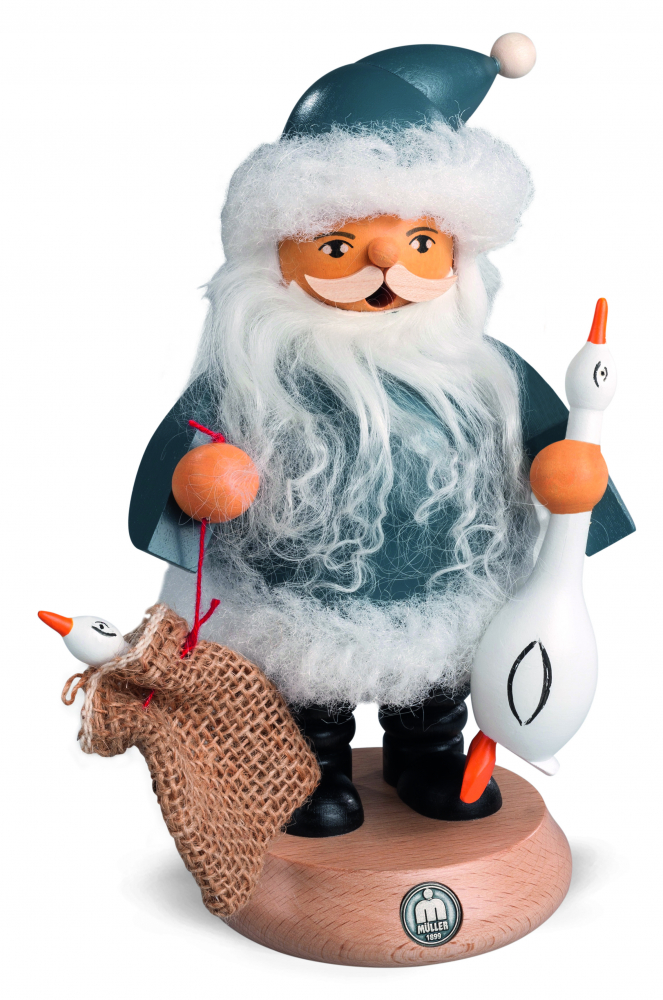Der Räuchermann "Nordic Santa" ist mit einem blauen Mantel bekleidet und hält 2 Weihnachtsgänse in seinen Händen. Er bringt Grüße aus dem Erzgebirge auch in ihre Wohnstuben. Der Nordic Santa besteht aus ca. 37 Einzelteilen und wurde aus 6 verschiedenen Holzarten gefertigt.