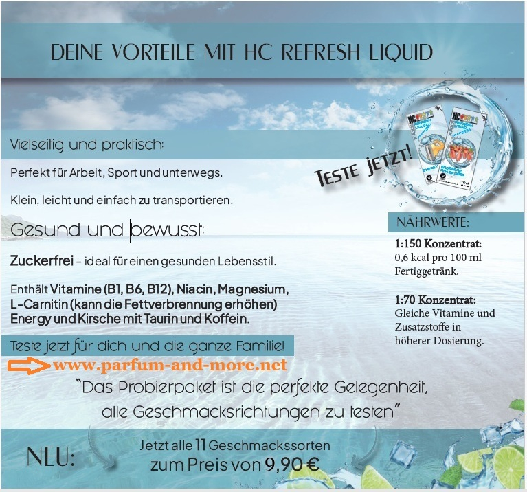 Durch das extrem effiziente Mischverhältnis sparen Sie Verpackungsmüll und aufwändiges Schleppen von Getränken. Ihr Rücken und die Umwelt werden es Ihnen danken! Ebenso kann HC Refresh Liquid dazu beitragen, mehr Platz zu schaffen, denn womöglich sparen Sie sich das Stapeln von Kästen oder PVC-Flaschen. HC Refresh Liquid ist in einer ca. 13 cm hohen Flasche abgefüllt und passt bequem in jedes kleine Regal in der Küche oder am Arbeitsplatz.
